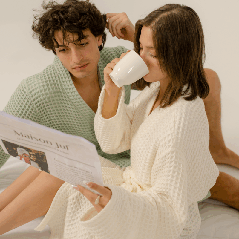 PACK MARIAGE (Nid d'abeille) Le pack mariage est un must have pour tous les futurs mariés. Il comprend : 2 peignoirs disponibles en plusieurs tailles, 2 draps de bain (150 x 90 cm), 2 serviettes de toilette (90 x 50 cm) et 2 tapis de bain, le tout accompagné d’une pochette de rangement gratuite. Profitez du confort du nid d’abeille, allié au luxe de nos élégantes couleurs.